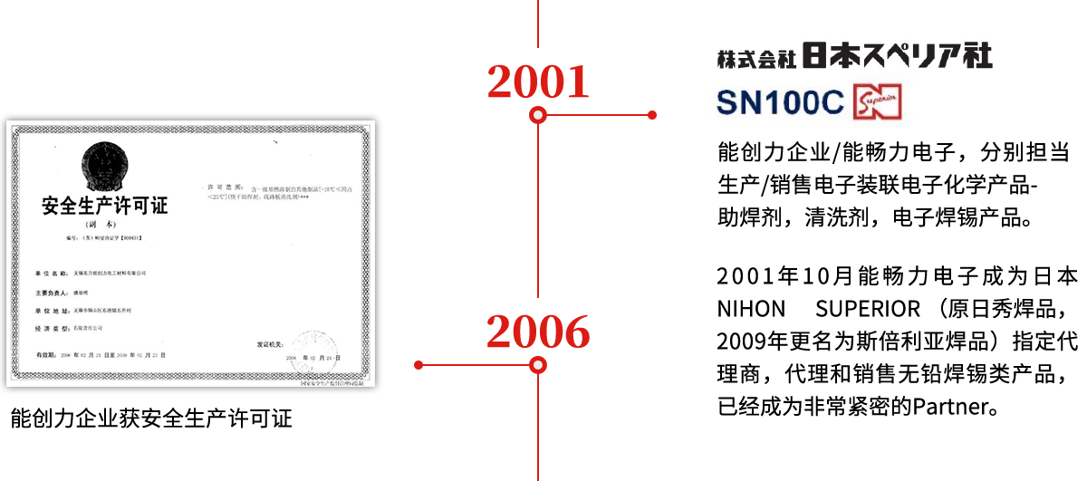 2001年,能創(chuàng)力公司創(chuàng)立了下屬企業(yè)無(wú)錫能暢力電子有限公司 ,該公司為貿(mào)易公司,是日本NIHON SUPERIOR指定的代理商,代理和銷(xiāo)售SN100C無(wú)鉛焊錫類(lèi)產(chǎn)品,已經(jīng)成為非常緊密的Partner。